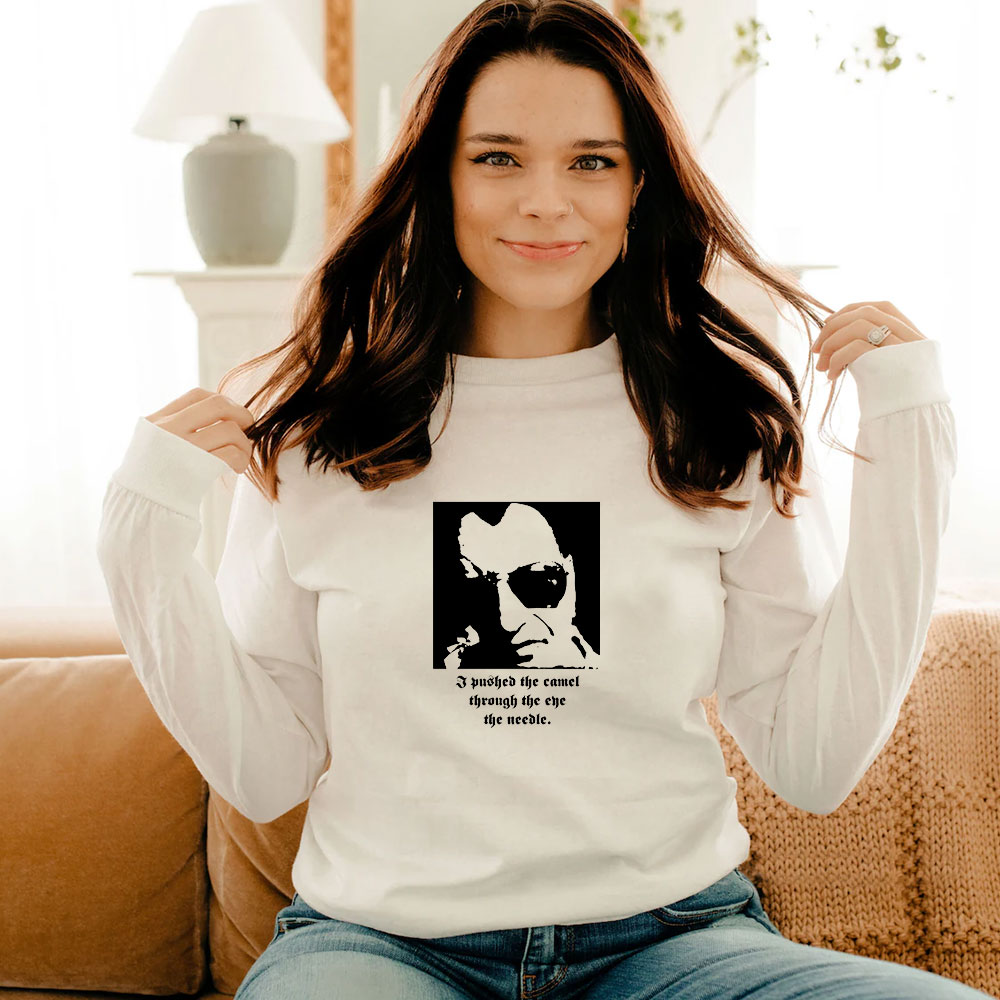 Dracula Flow I Pushed The Camel Long Sleeve The long sleeve crewneck tee brings daily versatility to any wardrobe and awaits to be customized with your unique ideas. Made with 100% combed, ring-spun cotton for a highly comfortable wearing experience, each tee comes side-seamed and with shoulder taping that helps the garment stay like new for longer.
