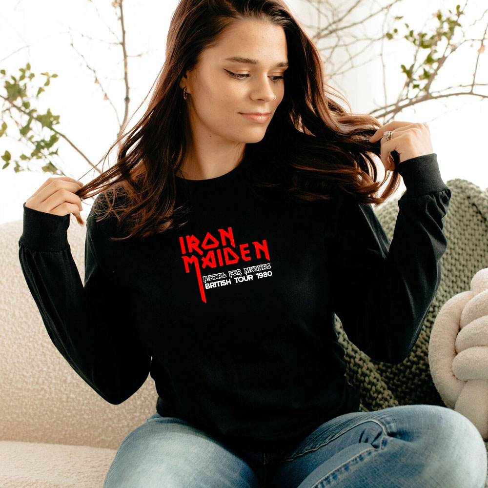 Iron Maiden 1980 Metal For Muthas Tour Long Sleeve The long sleeve crewneck tee brings daily versatility to any wardrobe and awaits to be customized with your unique ideas. Made with 100% combed, ring-spun cotton for a highly comfortable wearing experience, each tee comes side-seamed and with shoulder taping that helps the garment stay like new for longer.