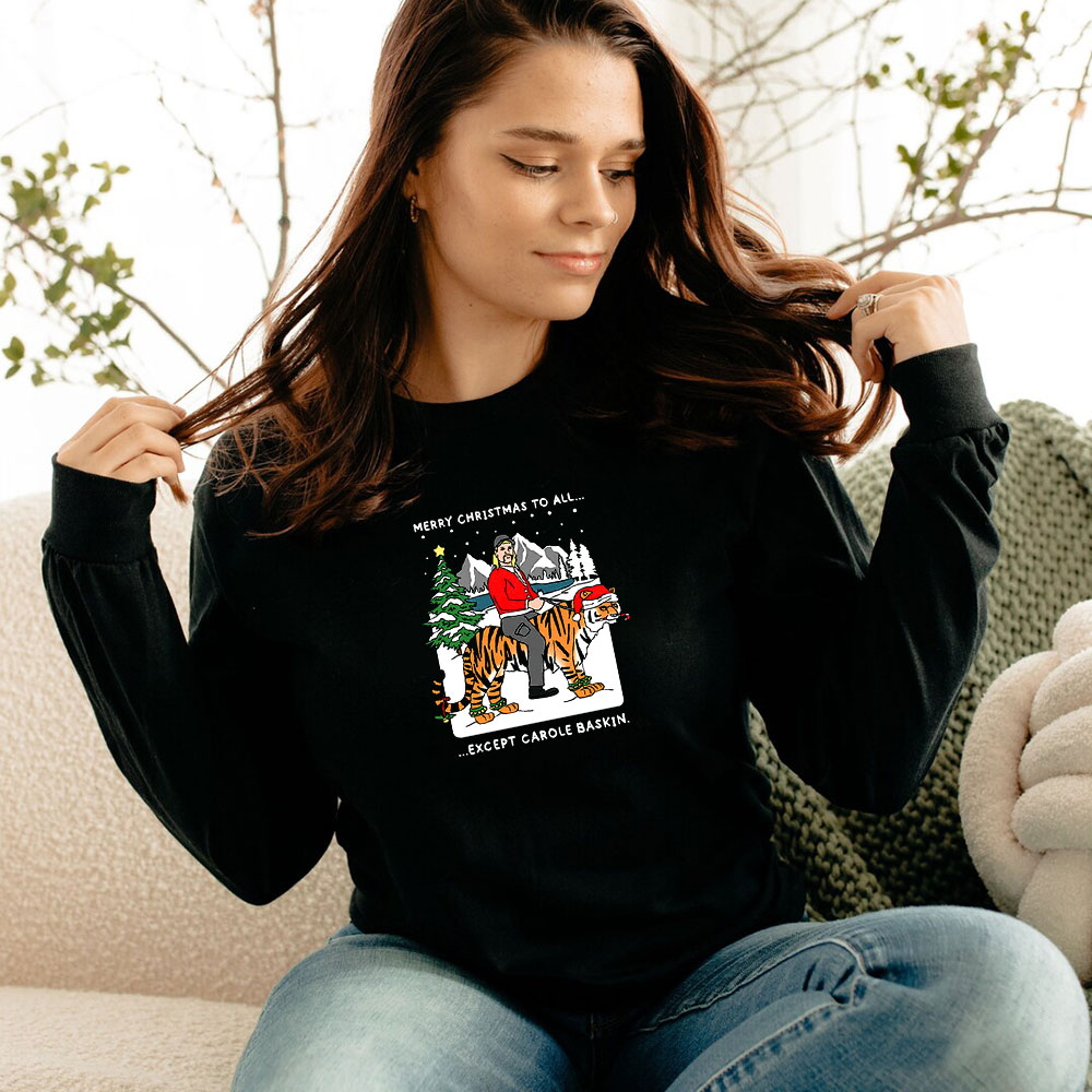 Joe Exotic Merry Christmas To All Except Carole Baskin Long Sleeve The long sleeve crewneck tee brings daily versatility to any wardrobe and awaits to be customized with your unique ideas. Made with 100% combed, ring-spun cotton for a highly comfortable wearing experience, each tee comes side-seamed and with shoulder taping that helps the garment stay like new for longer.
