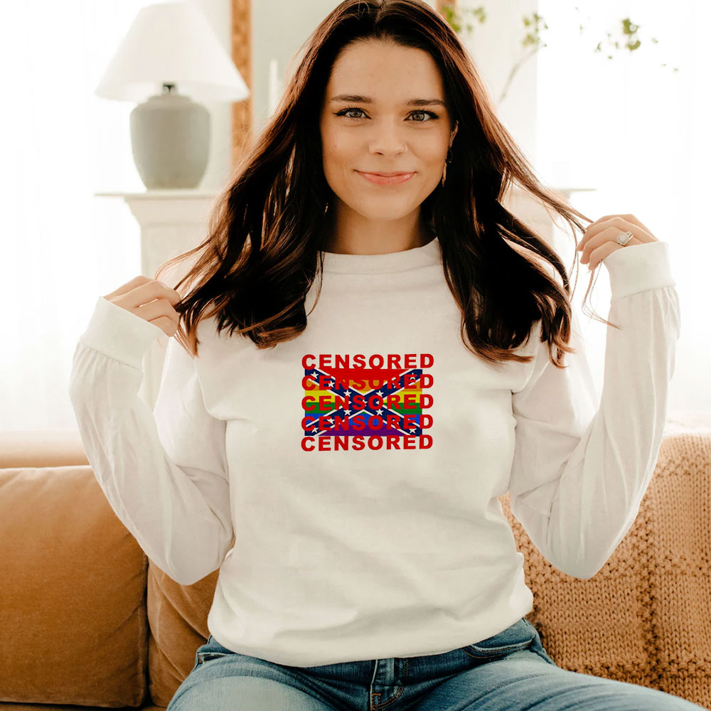 Rebel Pride Flag Censored Long Sleeve The long sleeve crewneck tee brings daily versatility to any wardrobe and awaits to be customized with your unique ideas. Made with 100% combed, ring-spun cotton for a highly comfortable wearing experience, each tee comes side-seamed and with shoulder taping that helps the garment stay like new for longer.